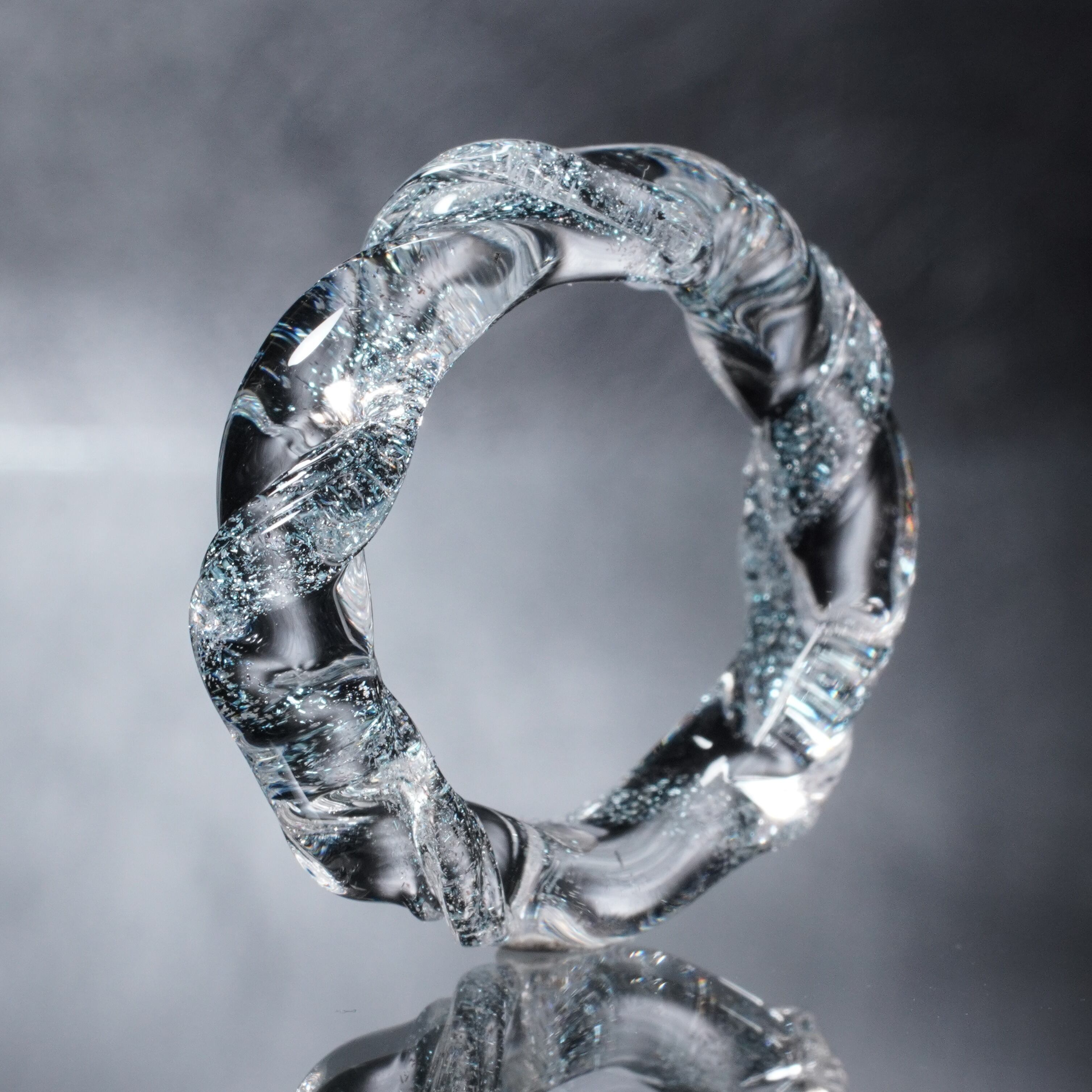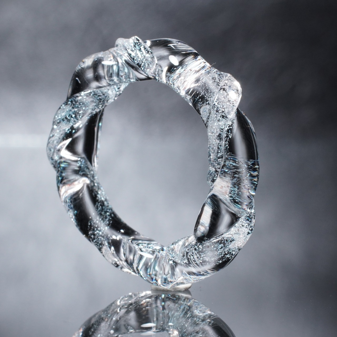 銀色に輝くダイクロガラスを使用して制作した硬質ガラス(ボロシリケイトガラス)製の指輪です。